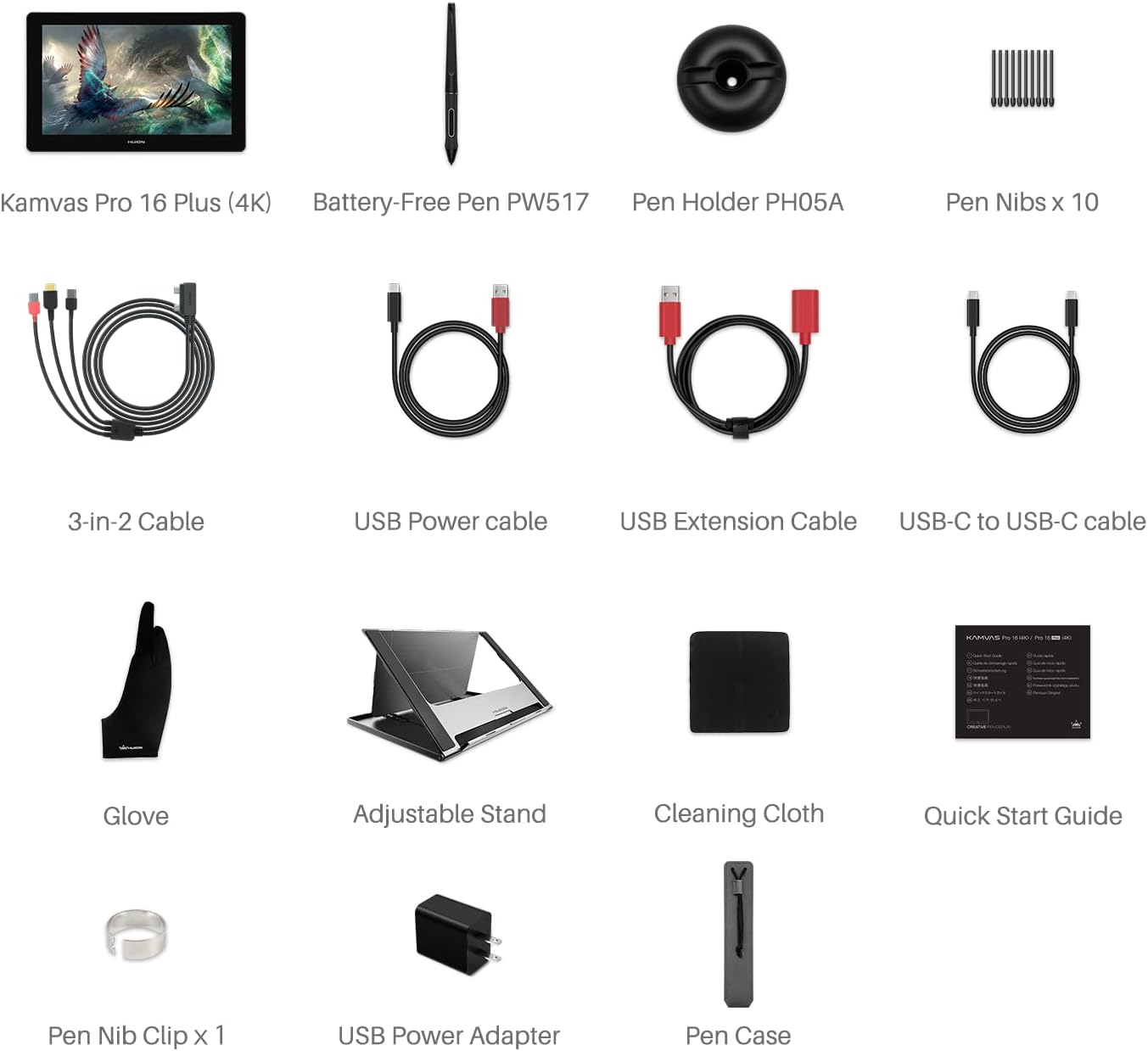 - Amazing Color Accuracy: Powered by Quantum Dot technology, Kamvas Pro 16 plus pen display brings you brilliant, true-to-life colors than ever before with 145% sRGB wide color gamut, while 1200:1 contrast ratio delivers deeper black and brighter white. It is engineered to meet color-critical professional needs and help you complete your best work.